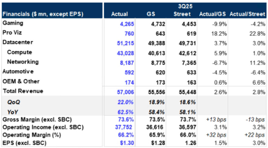 而这次业不例外:英伟达公布营收 570 亿美元,远高于市场普遍预期的 554 亿美元。毛利率 73.6%,略低于市场预期的 73.7% 。营业利润率 66.2%,略高于市场预期的 66.0%。营业每股收益 1.30 美元,高于市场预期的 1.26 美元。